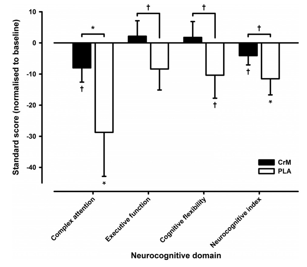 Cognitive Preservation: Under hypoxic conditions, cognitive scores for attention and executive function declined. However, in the creatine group, these cognitive measures were maintained at levels nearly comparable to normal conditions.