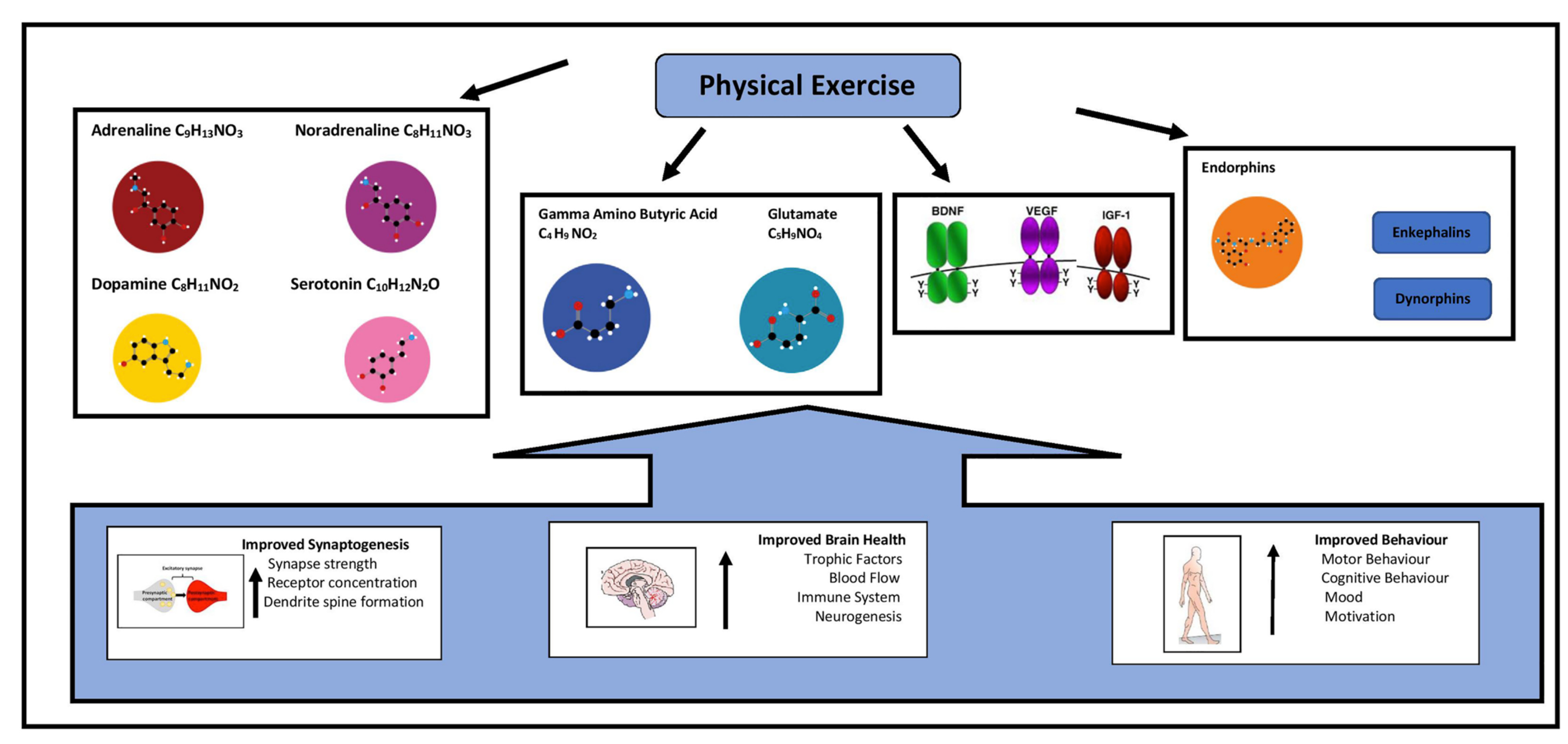 Neurotransmitter Release: Exercise causes the release of endorphins, dopamine, norepinephrine, and serotonin, enhancing mood, motivation, attention, and memory formation.