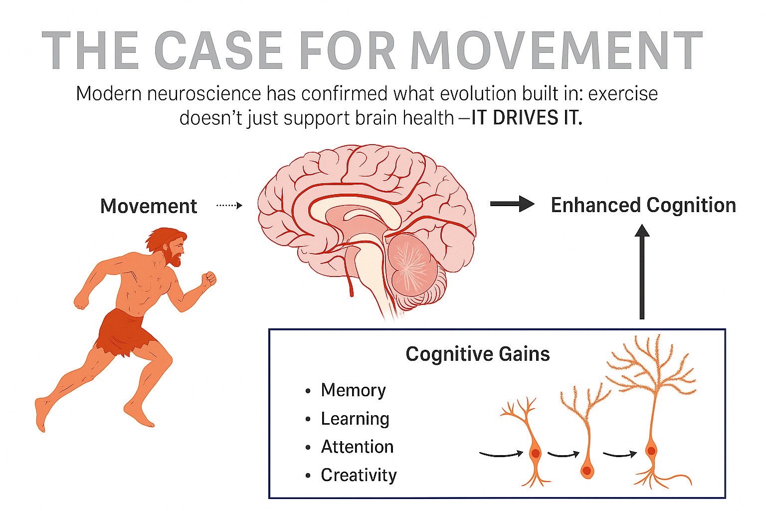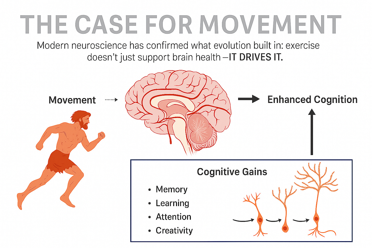 Your brain didn’t evolve behind a desk. For most of human history, our sharpest thinking; tracking prey, navigating terrain, solving problems, happened on the move. Cognition and physical activity were inseparable, and our biology still reflects that.