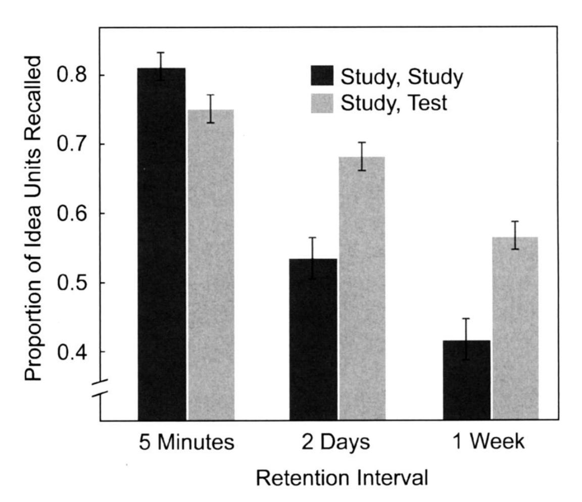 A landmark study with 120 college students found that those who tested themselves (without any feedback) retained 21% more information after one week compared to those who just reread their notes four times. The gap widened over time—the testing group forgot only 14% of material versus 52% in the study-only group.